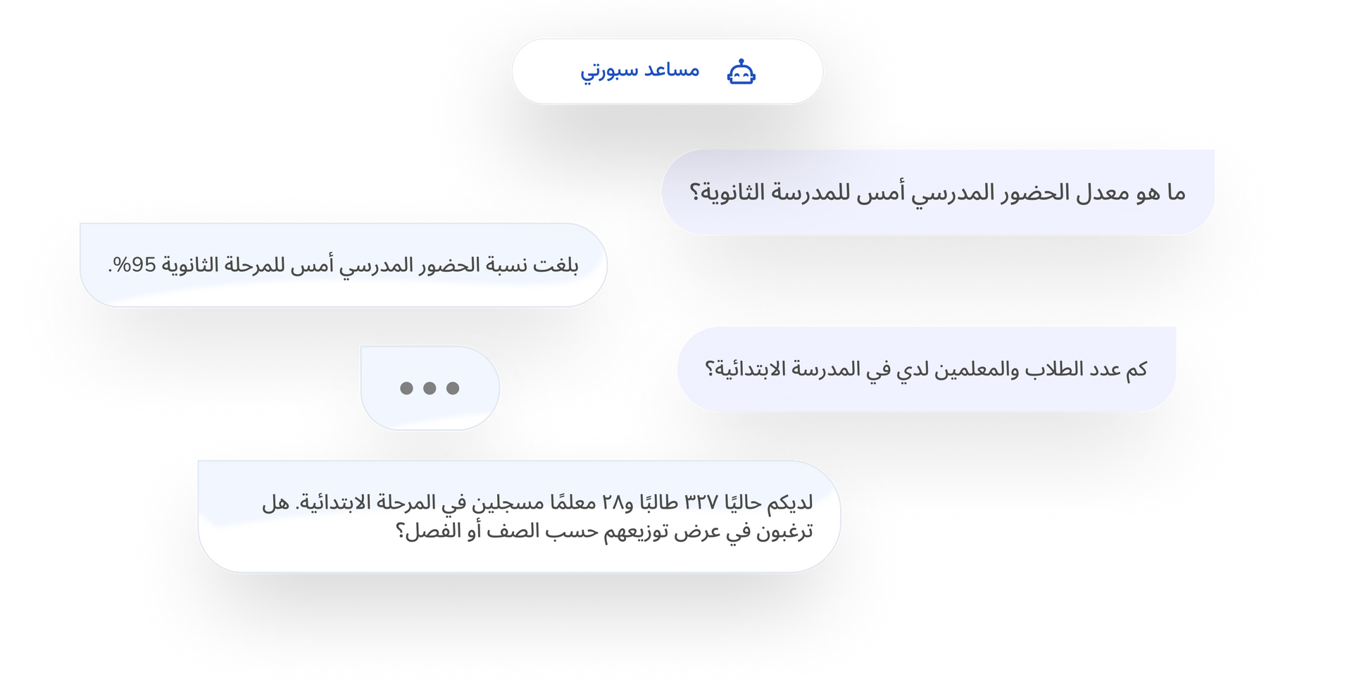 دعم فوري متى احتجت إليه، على مدار الساعة. يساعدك المساعد المعتمد على الذكاء الاصطناعي على التنقل في المنصة، واستعراض إحصائيات المدرسة، وتلقي المساعدة الفورية لأي استفسار يهمك.