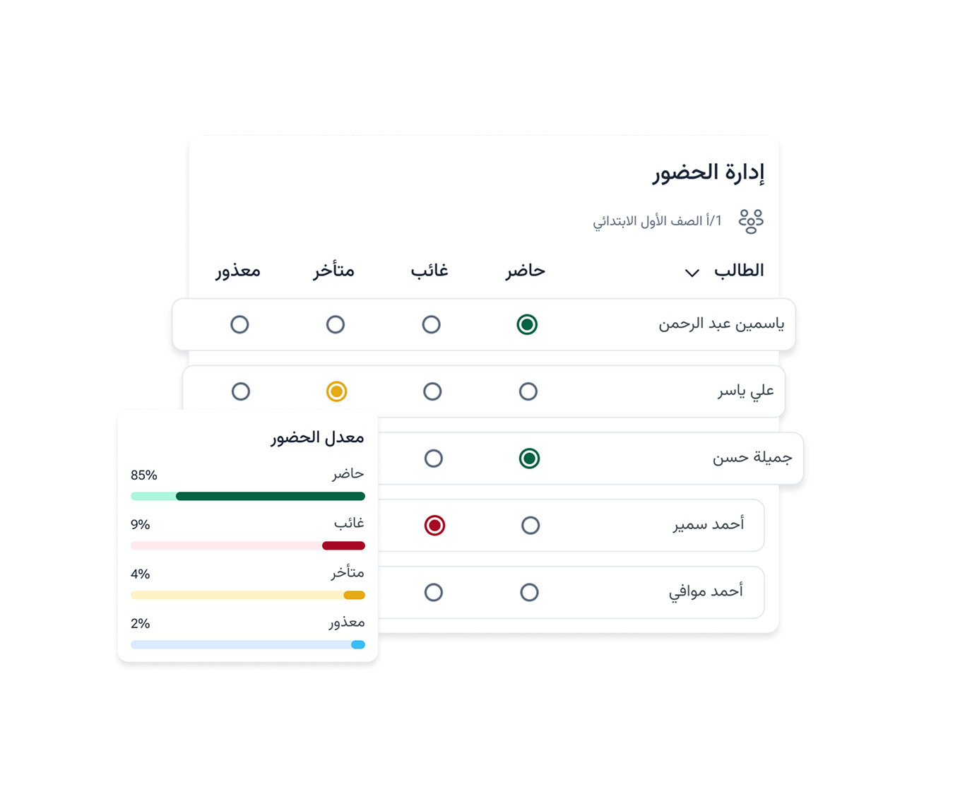 بنقرة واحدة فقط، يمكن للمعلم توثيق حالة حضور كل طالب (حاضر، غائب، متأخر، أو معتذر). مما يضمن إدارة دقيقة وميسّرة لسجلات المواظبة.
