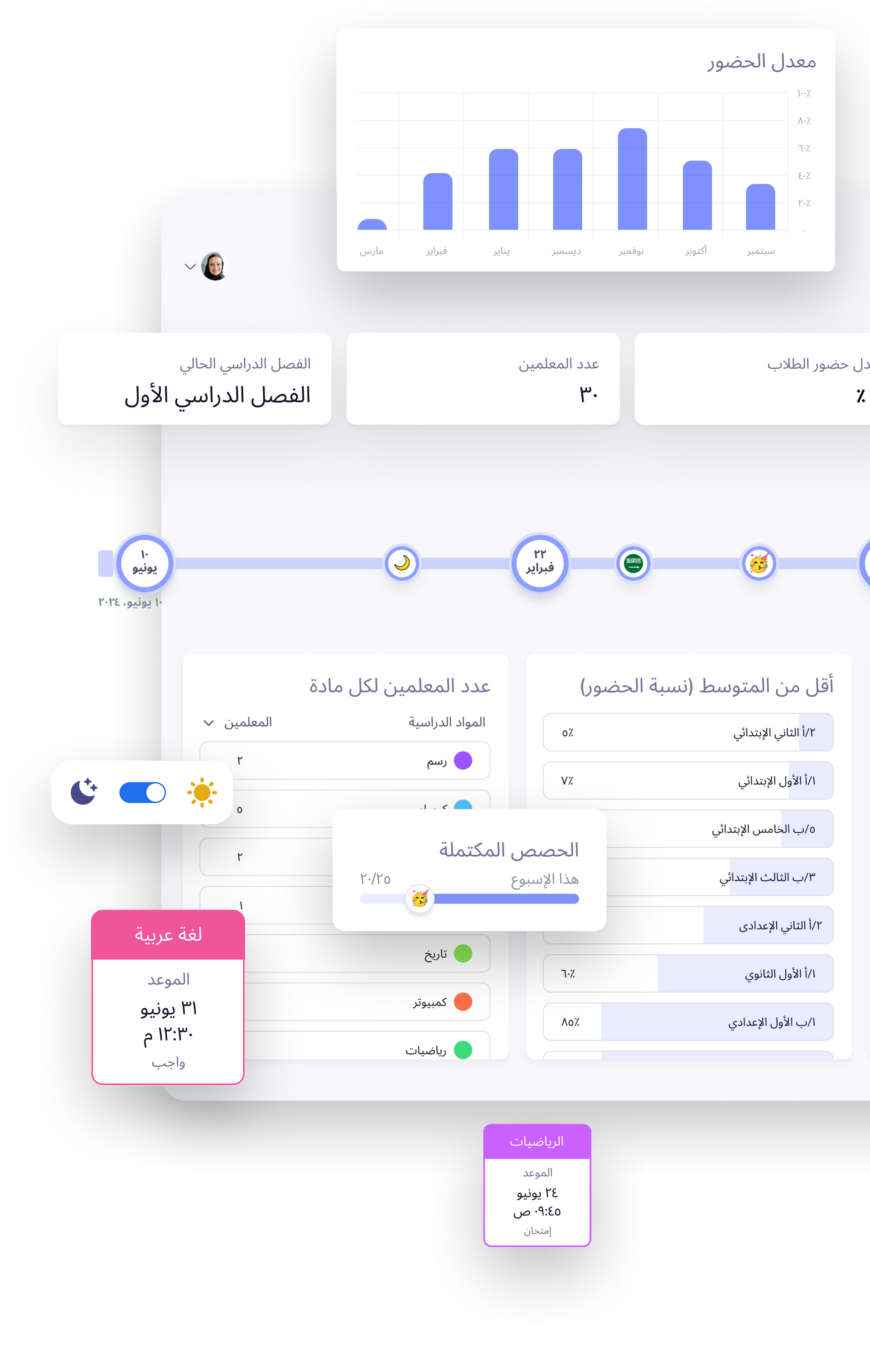تنظيم فعال لتوزيع المواد والفصول بين المعلمين. هذه الميزة تهدف إلى تحسين كفاءة العمل بشكل ملحوظ وتقليل أي تضارب أو تداخل محتمل في المسؤوليات.