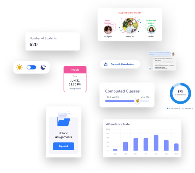 خصص حصصك الدراسية، ونظّم جداولك الدراسية، وقدّم الدعم للمعلمين بسهولة، كل ذلك من مكان واحد. يساعدك Saburati على إدارة بيئة تعليمية أكثر سلاسةً وتعاونًا.